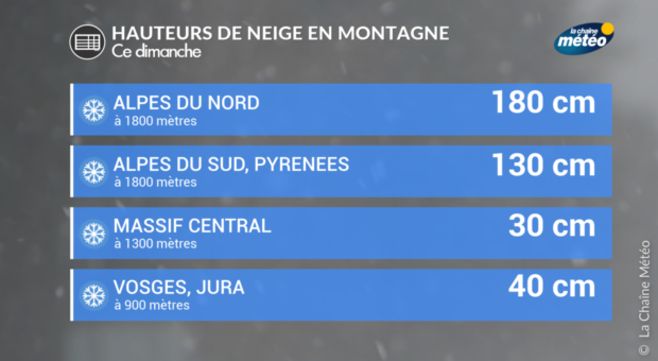 Dans les Alpes du Nord, la couche de neige atteint 1 m à 1200 mètres et 2,50 m vers 1800 m.