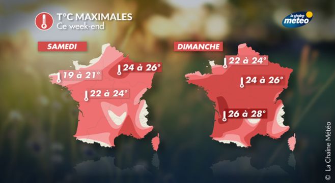 Après une semaine assez fraîche, les températures repartent à la hausse et repassent au-dessus des normales de saison. Ce samedi, comptez entre 22 et 24°C du nord au sud et de 25 à 28°C lundi prochain, un niveau de début d'été. Petit bémol : malgré le soleil, le fond de l'air est rafraichi sur les plages de la Manche et de la Mer du Nord en raison d'une petite brise de nord-est.