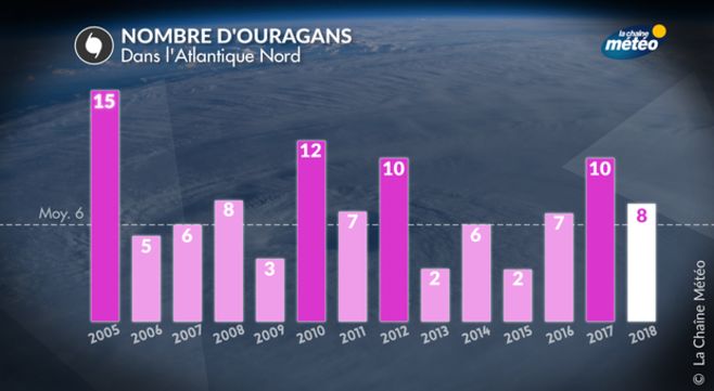 Entre août et octobre, 10 ouragans se sont succédés dans l’Atlantique, dont 6 « majeurs », c’est-à-dire ayant atteint au moins la catégorie 3/5 sur l’échelle internationale de Safir Simpson. Cette saison 2017 a été la plus active depuis celle de 2005, mais ne figure qu’en 7ème position des saisons les plus virulentes depuis le début des observations en 1851. A noter que cette saison s’est terminée en octobre avec l’ouragan « européen » Ophelia. Ce dernier cyclone a été atypique en raison de sa position très à l’est dans l’océan Atlantique, remontant jusqu’en Irlande.