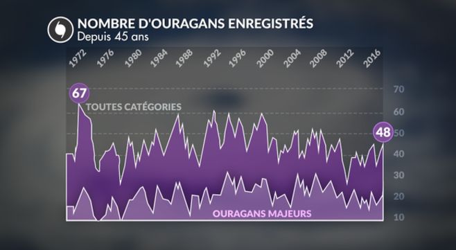 Contrairement aux idées reçues, le nombre total de phénomènes cycloniques est en légère diminution sur la planète depuis le début des relevés en 1851. Ce nombre était en augmentation dans l’Atlantique Nord entre 1950 et 1970 avant une baisse entre 1970 et 1990. Puis, la courbe du nombre d’ouragan est repartie à la hausse entre 1995 et 2010 avant cette dernière décennie anormalement calme. Le pic de 2017 marque donc un retour à la normale dans l’océan Atlantique Nord.
