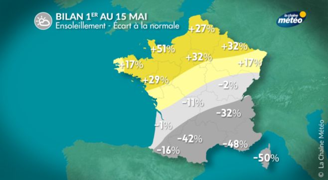 Au cours de la première quinzaine de mai, un anticyclone est venu s'installer plusieurs jours entre les Iles-Britanniques et l'Europe centrale. Il a véhiculé de l'air assez chaud et sec sur la partie nord du pays avec plusieurs journées très ensoleillées. Dans le même temps les dépressions ont circulé plus au sud que d'habitude, entre la péninsule ibérique et la Méditerranée. Il en a résulté des épisodes de fortes pluies et d'orages sur les régions du sud avec un ciel souvent bien nuageux.