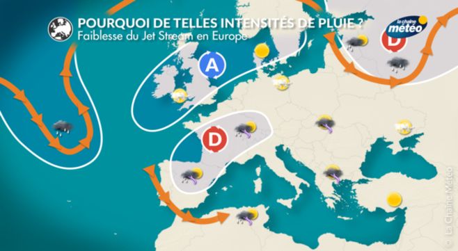 Enfin, autre paramètre à prendre en compte : la faiblesse des vents en haute altitude (le "jet stream") et au niveau du sol. Cela ne permet pas une circulation rapide des perturbations et des orages, qui ont tendance à stagner : on parle d'orages stationnaires. Du coup, ces orages, au lieu de durer 1 heure, persistent parfois plusieurs heures d'affilée sur une même zone, expliquant ainsi les importants cumuls de pluie enregistrés localement, et les inondations qui en découlent.