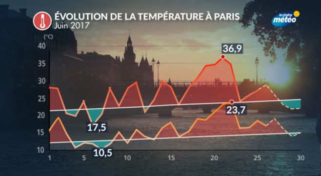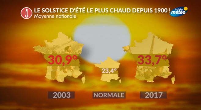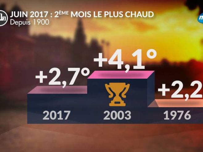 Avec un excédent de températures de l'ordre de 2,7°C par rapport à la normale 1981-2010, ce mois de juin 2017 se place en deuxième position des mois de juin les plus chauds, loin derrière le mois de juin 2003 où l'excédent avait atteint plus de 4°C.