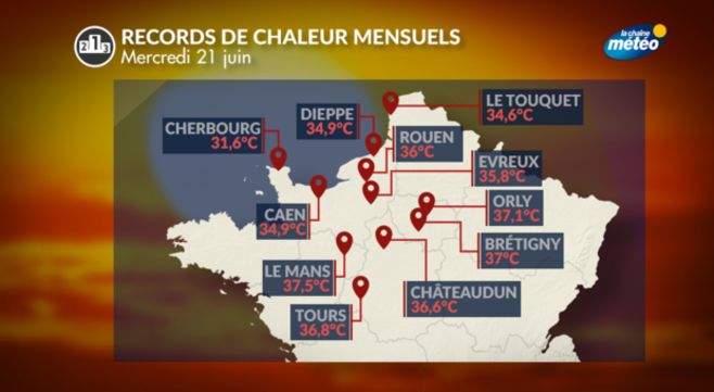Pendant cette vague de chaleur, de nombreux records mensuels de chaleur ont été battus aussi bien sur les températures minimales que maximales. On a relevé jusqu'à 35°C à l'ombre sur les côtes de la Manche, 38°C en région parisienne et jusqu'à 40°C à l'ombre à Monclus dans le Gard.