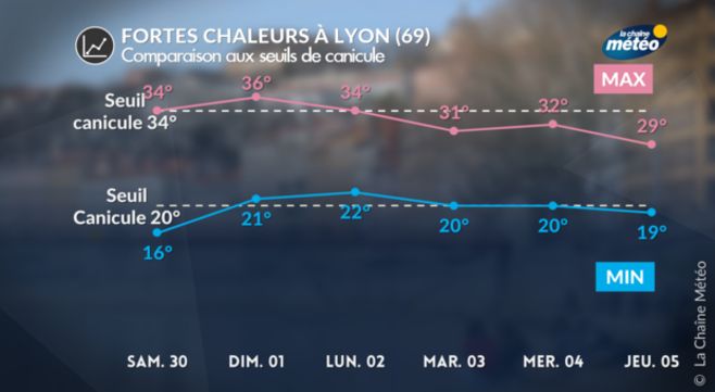 Pour cet épisode de chaleur, certains départements devraient atteindre les seuils de canicule pendant une journée ou deux mais pas forcément pour les 2 paramètres (minimales et maximales) et rarement plus de 3 jours consécutifs car les températures baisseront dès mardi prochain. Il est donc préférable de parler d'un épisode de très forte chaleur ou d'un pic de chaleur.