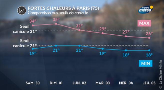 Au cours du week-end et jusqu'à lundi on attend des valeurs de températures de 25 à 28° près de la Manche de 29 à 34° sur les autres régions avec des pointes entre 35 et 37°C des plaines du sud-ouest au centre-est.