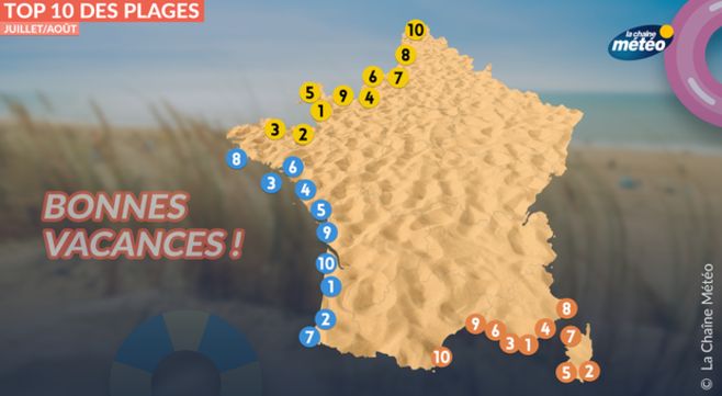 Avec plus de 5000 km de côtes, la France métropolitaine offre une extraordinaire variété de paysages maritimes. On y trouve des côtes rocheuses, sableuses et à falaises. Les marais, baies et caps offrent une multitude d’écosystèmes. Notre pays bénéficie ainsi du littoral le plus diversifié d’Europe. En ce premier jour des vacances d'été La Chaîne Météo vous propose son « top 10 » des plages pour la Manche - Mer du Nord, l'Atlantique et la Méditerranée.