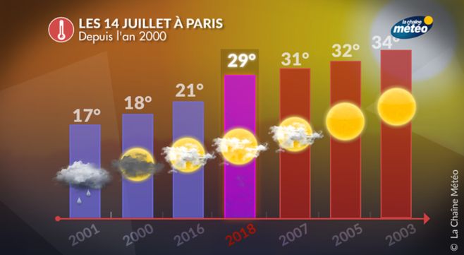 Depuis 1900, plus de quarante 14 juillet ont été concernés par des pluies ou quelques orages sur Paris, soit à peu près la moitié. Contrairement à la croyance commune « le 14 juillet est souvent pluvieux », les statistiques montrent que depuis 118 ans, le risque de pluie est simplement… de 1 sur 2 ! L’orage le plus spectaculaire s’est produit en 2010. Cette année-là, le traditionnel défilé parisien du 14 juillet s’est terminé sous un violent orage, avec des trombes d’eau qui ont déversé 43 mm de pluies en quelques heures, provoquant quelques inondations.