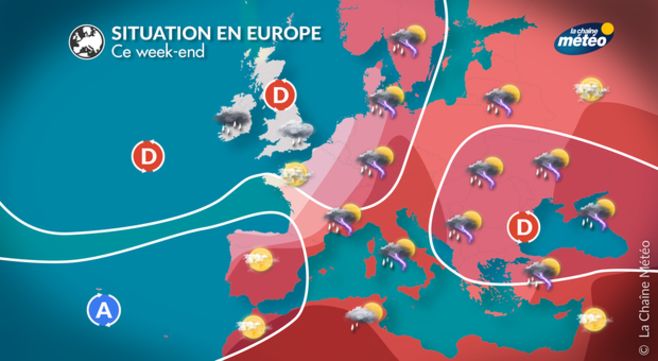 Samedi, une perturbation orageuse s'étend des Pyrénées aux frontières de l'est avant de s'éloigner vers l'Allemagne et la Provence. Dans ce contexte, les orages peuvent être forts en Alsace et Rhône-Alpes. A l'arrière, une amélioration se met en place par l'Atlantique avec l'orientation du vent à l'ouest. Cette masse d'air plus océanique, et donc plus tempérée, favorise la baisse des températures.
