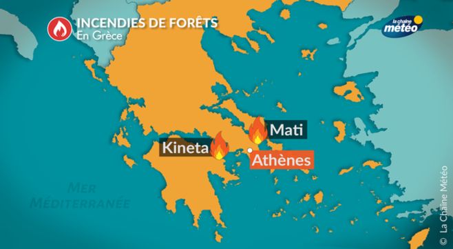 Les incendies se sont déclenchés dans deux villes voisines de la capitale grecque. A Mati, située à 40 km à l’est d’Athènes, des personnes se sont retrouvées piégées par les flammes. Un autre brasier a pris naissance à l’ouest d’Athènes, à Kineta.