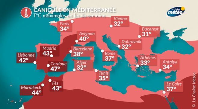 Pour ces premiers jours du mois d'août, de l'air subsaharien, très chaud et sec, concerne la péninsule ibérique et la France Les températures atteindront 41 à 42°C à Lisbonne (au niveau des records) et 43°C à Madrid. Sur le sud de l'Espagne et du Portugal, on attend 46 à 47°C sur des villes comme Evora, Séville ou Cordoue. On pourrait même très localement se rapprocher de la barre des 50°C qui n'a encore jamais été atteinte.