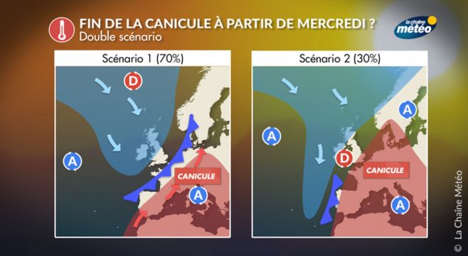 A ce jour, la fin de la canicule ne se produira pas avant le milieu de semaine prochaine au nord et à l'ouest (avec l'arrivée des orages), et seulement en fin de semaine pour le sud-est (qui pourrait échapper aux orages).