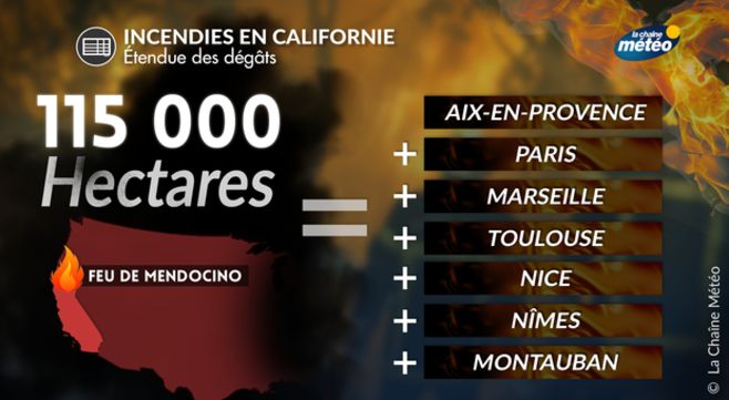 Les feux du nord de la Californie ont doublé au cours des 3 derniers jours : 16 foyers d'incendies sont en cours ce mardi et le plus important (Mendocino Fire) a déjà brûlé 117 000 hectares. 14 000 pompiers sont mobilisés et une dizaine de victimes sont à déplorer.