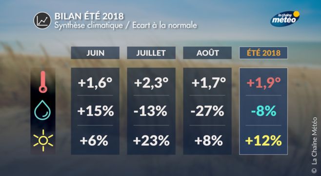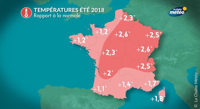 Avec un excédent de température de 1,9°C par rapport à la normale calculée sur la période 1981-2010, cet été 2018 vient en deuxième position des étés les plus chauds, loin derrière 2003 (+3,2°C) et avant 2017 et 2015 (+1,5°C). Le mois de juillet a été le mois le plus chaud de cet été avec un excédent de +2,3°C ; il vient en 3ème position des mois de juillets les plus chauds en France après 2006 et 1983.