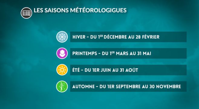 Pour établir des statistiques, il est alors plus facile de fixer le début et la fin des saisons météorologiques en début et fin de mois (contrairement aux saisons calendaires). Pour les mêmes raisons, l’hiver se situe de part et d’autre du minimum de températures observé à la mi-janvier et englobe les mois de décembre, janvier et février. Logiquement, le printemps et l’automne sont les deux saisons de transition entre l’hiver et l’été.