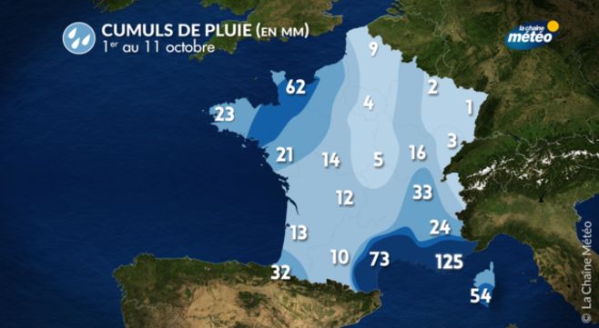 Il est tombé en 24 heures 52 mm à Vannes, 60 mm à Caen et jusqu'à 66 mm de pluie à Rennes ce qui constitue un record pour un mois d'octobre pour cette station. Sur cet axe allant du golfe du Morbihan à la plaine de Caen, ces précipitations ont été très bénéfiques pour la nature et l'on ne parle plus se sécheresse... En revanche du sud-ouest au nord-est en passant par le Centre et le Bassin parisien, les précipitations ont été très insuffisantes voire inexistantes ce week-end et la sécheresse reste très importante. Dans le sud-est, les précipitations orageuses ont donné 10 à 30 mm en général mais localement plus de 50 mm sur l'est du Var et l'ouest des Alpes-Maritimes.