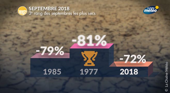 En moyenne sur la France, le déficit pluviométrique atteint 72% ce qui fait de ce mois de septembre l'un des plus secs depuis le début des relevés météo. Il faut remonter au mois de septembre 1985 pour retrouver un tel déficit de pluie sur le pays.