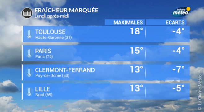 Dans ce flux de nord, des averses circulent sur le quart nord-est du pays et les premières neiges se produisent au-dessus de 1200 à 1500 m, notamment sur les Vosges, le Jura et le nord des Alpes. Lundi après-midi, les températures maximales plafonnent en-dessous de 15°C sur les plaines du centre-est au nord-est. Il faut se diriger vers les côtes méditerranéennes pour dépasser encore les 20°C.