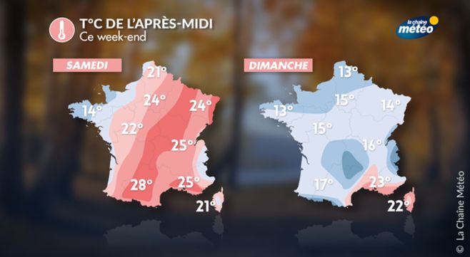 Après un vendredi doux et même estival dans le sud, les températures restent estivales ce samedi du sud-ouest au nord-est avec des valeurs allant de 24 à 28°C. Il fait déjà nettement plus frais sur la Bretagne avec des températures autour de 13 à 16°C en milieu d'après-midi. Dimanche, avec le passage à un flux de nord, les températures sont en chute avec 13 à 17°C sur la moitié nord et 16 à 23°C sur la moitié sud. Le ressenti sera donc beaucoup plus automnal.