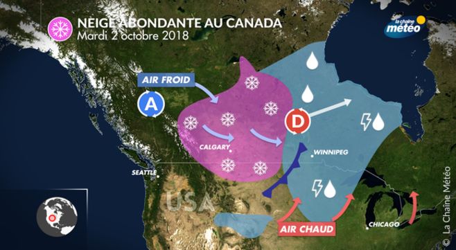 Une première vague de froid vient de débouler au nord-ouest du Canada, jusqu'au Montana (Rocheuses américaines). La neige a atteint une épaisseur record pour un mois d'octobre au Canada.