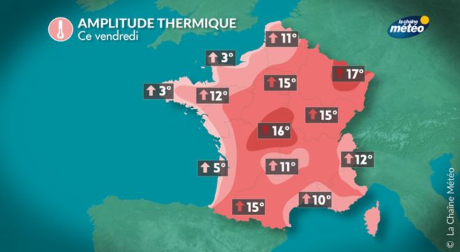 Il faut notamment s’attendre vendredi 4 octobre à de fortes amplitudes thermiques dans le Grand-Est, notamment près des Ardennes ou encore dans le centre-ouest. Ces dernières pourraient approcher les 20°C. Les littoraux, surtout de la Manche et de l’Atlantique connaîtront des amplitudes bien plus faibles, souvent autour de 3 à 5°C.