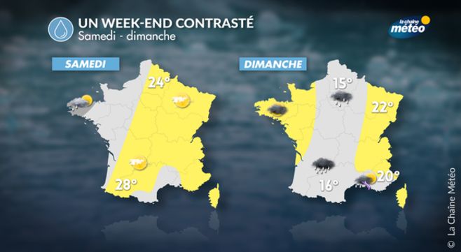Demain dimanche, de l'air beaucoup plus frais envahit le pays par l'ouest. La chaleur résiste à l'avant de la perturbation avec 22 à 28°C de l'Occitanie au Grand-Est. Plus à l'ouest, sous les pluies, les températures plafonneront sous la barre des 16-17°C près de l'Atlantique.