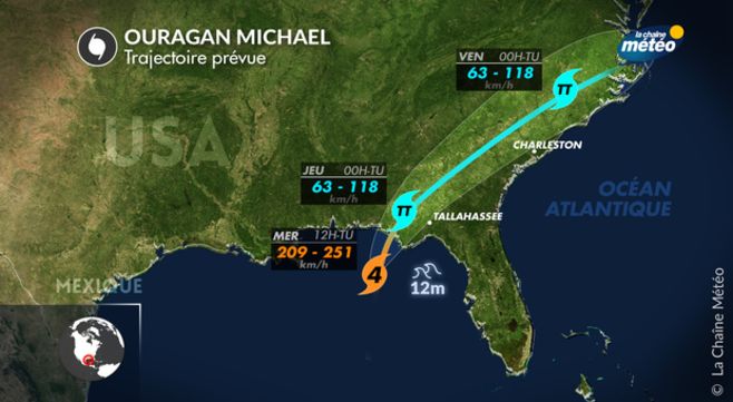 L'entrée de l’ouragan Michael dans les terres américaines est prévue à partir de mercredi midi 15h TU (soit en milieu de matinée heure locale). L'ouragan touchera en ouragan majeur, c'est-à-dire avec des vents moyens sur une minute supérieurs à 178 km/h. Un scénario, très aggravant, prévoit des rafales possibles à 230 km/h sur les côtes floridiennes.