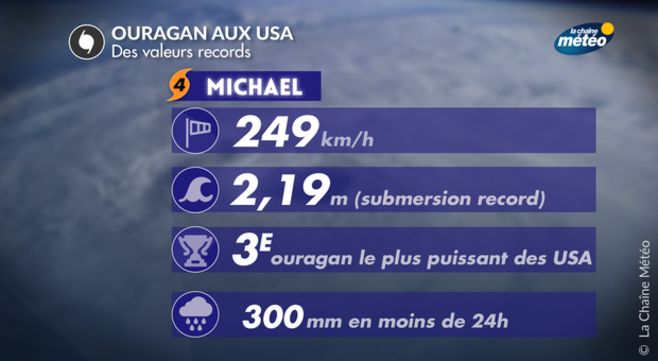 Actuellement, l'ouragan majeur #Michael touche le nord-ouest de la Floride, à Panhandle. Le dernier rapport du @NHC_Atlantic estime que les rafales de vent atteignent 270 km/h. Jamais un ouragan de cette puissance n'avait touché cette zone auparavant. pic.twitter.com/NntPGZepPR