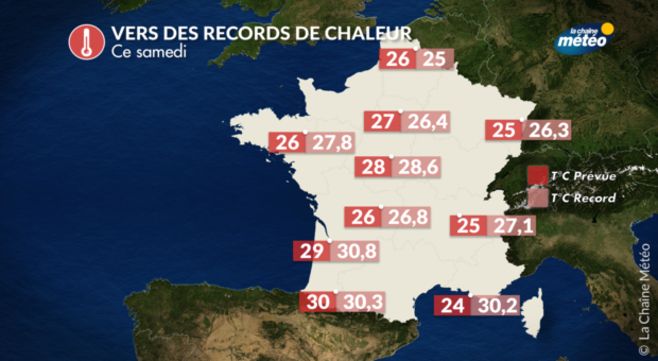 Après une semaine très contrastée avec un temps sec et chaud au nord et pluvieux en Méditerranée où le calme est enfin revenu en cette fin de semaine. Sous le soleil et avec un vent de sud sensible les températures s’envolent samedi pour probablement battre certains records du centre-ouest au Grand-Est. Vous frôlerez même les 30°C si vous habitez au pied des Pyrénées.