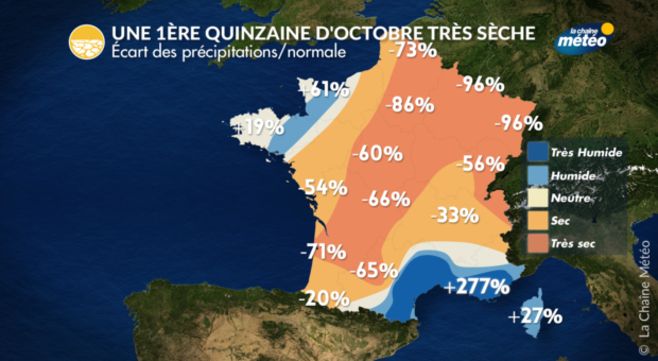 Avec la persistance de conditions anticycloniques du nord de la France à l'Europe Centrale, les conditions météo sont restées calmes et sèches du centre au nord-est. La première quinzaine d'octobre est l'une des plus sèches de ces 50 dernières années avec 1 mm à Strasbourg et Nancy, 2 mm à Metz et Colmar, 3 mm à Besançon, 4 mm à Paris et Clermont-Ferrand.