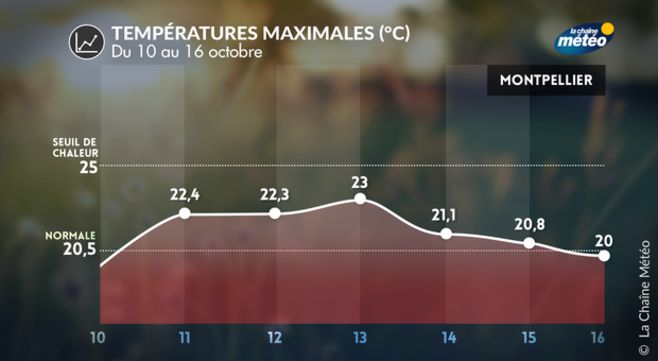 Dans le même temps les températures sont restées plus modestes dans le sud, notamment au sud-est, en raison des intempéries. A Montpellier, le seuil de chaleur n’a même pas été dépassé une seule journée entre le 10 et le 16 octobre, même si les températures sont restées dans les normales saisonnières.