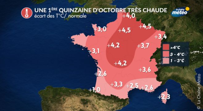 C’est en fait tout le centre-ouest, le Val-de-Loire, le bassin-parisien et le Grand-Est qui ont connu une période particulièrement douce. Les écarts aux normales ont atteint +4 à +4,5°C du Centre-Val-de-Loire aux Hauts-de-France et aux Ardennes et d’une manière plus générale de +1 à +2,5°C. Des records de chaleur ont ainsi été atteints voire battus comme à Paris le 13 octobre dernier avec 27,2°C.