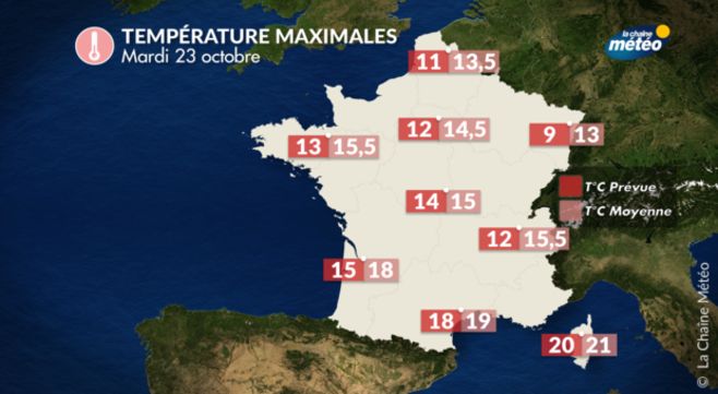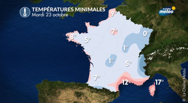 La matinée de mardi sera la plus fraîche avec localement des gelées au sol possibles de l’Alsace au Massif-Central, si les nuages ne sont pas trop nombreux durant la nuit précédente. En parallèle, vous devrez vous méfier des brouillards matinaux très fréquents en cette période en raison des nuits qui rallongent et des températures plus basses. Enfin, le vent du nord soufflera modérément sur la moitié nord, tout comme le Mistral et la Tramontane qui se renforceront en Méditerranée et maintiendront un ressenti assez frais.