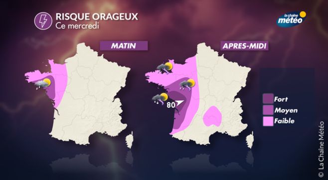 Derrière le passage de la perturbation, un ciel de traîne actif se met en place avec un risque orageux surtout localisé près de la Vendée et des Charentes. L’instabilité pourrait être marquée d’une manière générale sur l’ensemble des régions allant de la Normandie à la Nouvelle-Aquitaine. Vous ne serez donc pas à l’abri d’averses potentiellement orageuses durant toute votre journée. Les rafales sous les grains pourraient atteindre localement les 80 à 90 km/h.