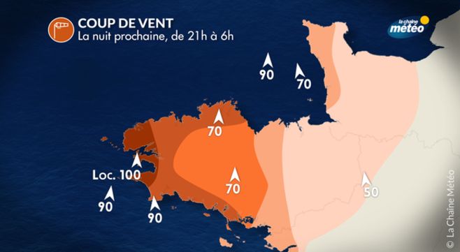 A l'approche de la perturbation, le vent se renforce durant la nuit de mardi à mercredi et les rafales atteignent les 70 à 90 km/h de la Vendée à l'intérieur de la Bretagne avec des pointes autour de 100 km/h sur la pointe du Finistère. Attention si vous devez-vous déplacer dans ces régions durant la nuit de mardi à mercredi, puis la matinée de mercredi.