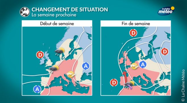 A partir de mercredi et jusqu'en fin de semaine, la France passe sous l'influence d'un anticyclone présent sur l'Europe centrale. Le temps est sec quasiment partout. Les matinées sont plus fraîches et parfois brumeuses dans les plaines et les vallées puis le soleil s'impose plus ou moins facilement au gré de la dissipation des nuages bas. Seule exception, le Languedoc-Roussillon où les entrées maritimes persistent, apportant un temps médiocre et quelques ondées sur les Cévennes.