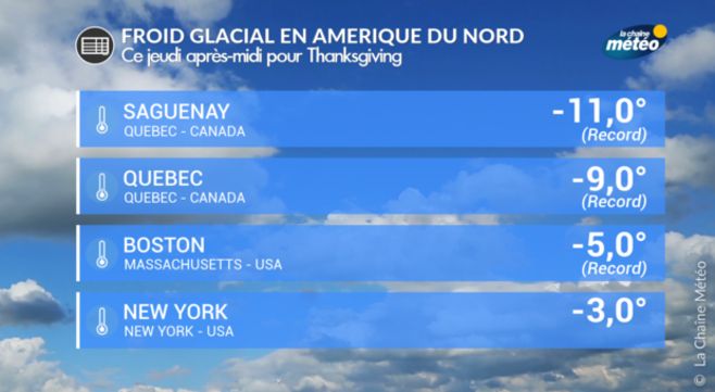Ce jeudi de Thanksgiving sera probablement le plus froid enregistré depuis plus de 100 ans : une descente d’air froid sur l’est de l’Amérique du Nord donnera lieu à des températures records l’après-midi.