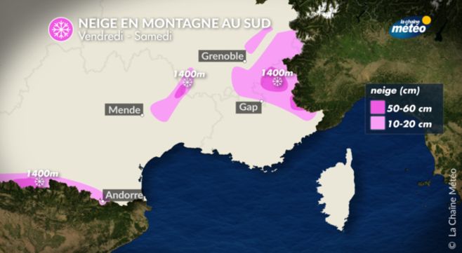 Une dépression située dans le Golfe du Lion vendredi va apporter de fortes précipitations dans le quart sud-est et de la neige en altitude. La neige tombera dans un premier temps sur les Pyrénées mais surtout côté espagnol avant de concerner les Alpes du sud dans la journée de vendredi. Il neigera beaucoup au-dessus de 1500 mètres en moyenne mais la limite pluie/neige pourrait varier d’un versant et d’un massif à l’autre. Sur l’ensemble de l’épisode on peut attendre entre 10 et 20 cm sur les Hautes-Pyrénées et l’Ariège et jusqu’à une trentaine de centimètres dans le massif des Ecrins et du Mercantour.