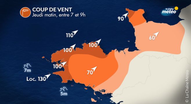 Le vent se renforce progressivement dans la nuit de mercredi à jeudi de la Loire Atlantique aux Hauts-de-France. Les plus fortes rafales sont attendues en matinée, entre 7h et 9h, avec 100 à 110 km/h sur les côtes exposées du Finistère et localement jusqu’à 130 km/h. Des vagues de l’ordre de 5 à 7 mètres seront possibles, notamment de la Côte de Cornouaille à la Mer d’Iroise, mais les coefficients de marée n’étant pas élevés, le risque de submersions littorales restera limité.