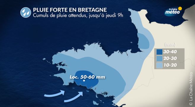 Il a bien plu depuis le début de semaine sur la Bretagne. Cette nouvelle perturbation devrait apporter une lame d’eau supplémentaire de l’ordre de 50 à 60 litres/m2, notamment entre Lorient et Quimper et en remontant sur les monts d’Arrée. D’autres pluies sont attendues durant votre week-end et ces mêmes régions pourraient donc avoir cumulé d’ici dimanche soir une centaine de millimètres.
