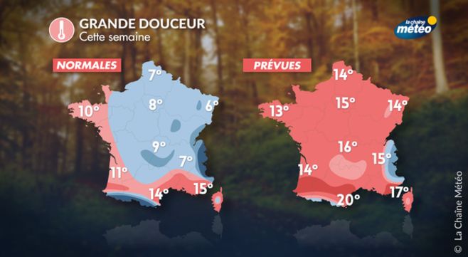 Tout au long de la semaine il fera doux, voire très doux. Vous bénéficierez d'une douceur très agréable et quasi printanière dans le sud où vous resterez globalement à l'écart des pluies avec 15 à 18°C les après-midis, jusqu'à 22°C au pied des Pyrénées et dans l'arrière-pays méditerranéen par effet de foehn. Dans le nord, on attend entre 12 et 16°C mais comme il pleuvra souvent et qu'il y aura beaucoup de vent, le ressenti ne sera pas agréable du tout. En moyenne montagne, on n'attend pas de chutes de niege en dessous de 2000 mètres en moyenne alors que les vacances de Noël se rapprochent.