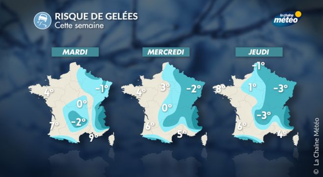 Ainsi, un fort contraste de températures va se mettre en place entre l’est et l’ouest avec parfois plus de 10°C entre l’Alsace et le Finistère, notamment jeudi matin. Mardi, le ciel s’éclaircit peu à peu malgré les grisailles matinales dans certaines plaines et vallées. Il devrait alors geler du Grand-Est au centre-est avec de -1 à -2°C en général. Mercredi et jeudi le risque de gelées concernera l’ensemble de la moitié est, hormis le pourtour méditerranéen avec jusqu’à -3°C sous abri.