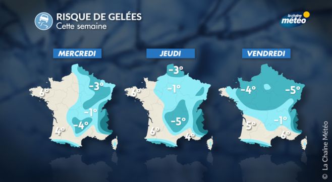 De faibles gelées ont pu être observées ce mardi, en particulier dans le centre-ouest, près des frontières du nord-est et dans le sud-ouest. Les valeurs étaient souvent comprises entre 0 et -2°C. Entre mercredi et samedi, ces gelées devraient s’étendre à la majorité des régions et s’accentuer. Elles concerneront essentiellement la moitié est mercredi et jeudi avec des valeurs généralement comprises entre -1 et -3°C. Vendredi, il devrait geler essentiellement sur la moitié nord avec des valeurs souvent comprises entre -3 et -5°C. Samedi devrait marquer le pic de froid avec jusqu’à -6°C/-7°C dans certaines vallées et plateaux du Massif central avant que les gelées ne diminuent en intensité dimanche et se retranchent dans les régions les plus à l’est.