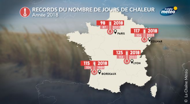 Avec un excédent de l'ordre de 2°C en moyenne sur la France, l'été 2018 se place au 2ème rang des étés les plus chauds devant 2003 (+3,2°C) mais devant 2017 (+1,5°C). Le nombre de jours de chaleur atteint des valeurs records sur de nombreuses villes du nord et de l'été même si l'intensité de la canicule observée en juillet a été moindre que celle enregistrée en août 2003. Le 26 juillet un record absolu de température est battu à Lille avec 37,6°C, valeur jamais atteinte depuis l'ouverture de la station en 1944 !