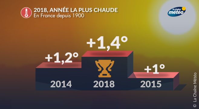 En cette mi-décembre 2018, un premier bilan des températures montre que cette année 2018 se place au 1er rang des années les plus chaudes depuis 1900. Avec un excédent de l'ordre de 1,4°C, 2018 devance les années 2014 (+1,2°C) et 2015 (+1,1°C°).