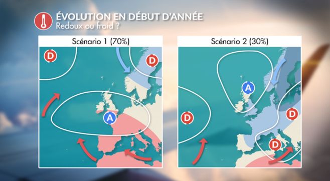 Par la suite, cette "patate anticyclonique" devrait se déplacer en première décade de janvier. Deux scénarios météos sont possibles : si l'anticyclone s'affaisse vers le sud, il laissera revenir progressivement le vent d'ouest humide et plus doux sur le nord de la France. Mais s'il se décale vers le nord, il permettrait aux vents de s'orienter au secteur nord-est, occasionnant dans ce cas un net refroidissement.