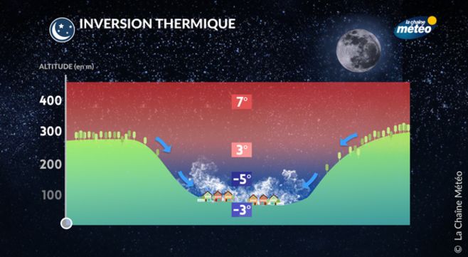 En période anticyclonique d’hiver, les phénomènes d’inversion thermique sont très fréquents, provoquant de longues journées froides et grises dans les dits « trous à froid » (vallées, plaines …) alors que de l’air beaucoup plus doux stagne en montagne.