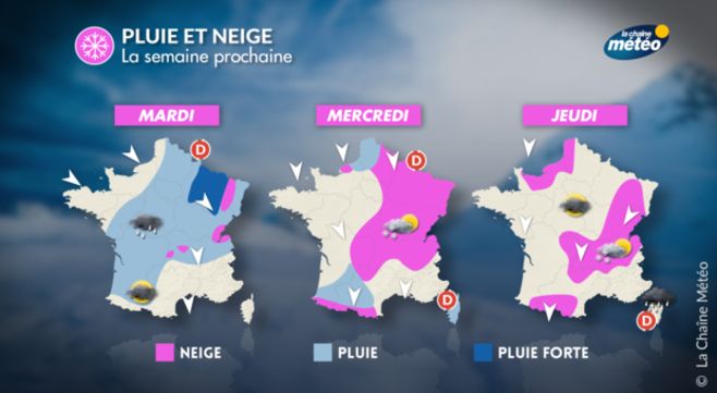 Mercredi est la journée à surveiller car la neige pourra descendre jusqu'en plaine entre le nord-est et le Centre-est. Cependant, si la neige ne devrait que temporairement tenir en plaine, sous les plus grosses giboulées alors que dès les premières hauteurs les sols seront bien blanc. En montagne, il neigera sur l'ensemble du Massif central, les Vosges, le Jura et le nord des Alpes avec 15 à 30cm de poudreuse, ainsi que sur les Pyrénées mais en moindre quantité.
