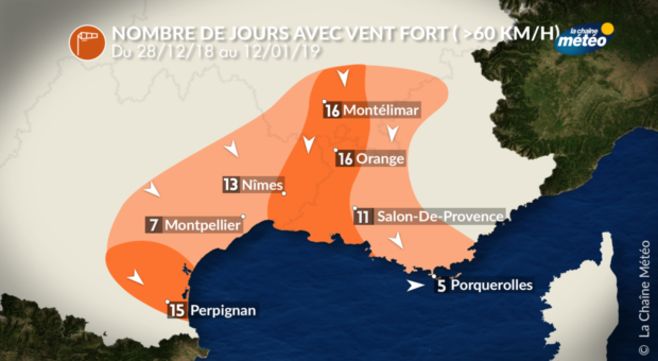 Entre le 28 décembre 2018 et le 12 janvier 2019, des villes comme Montélimar et Orange ont connu 16 journées consécutives avec fort vent (>60 km/h). Nîmes a connu, quant à elle, 13 journées non consécutives avec fort vent et Perpignan, 15. La journée du 5 janvier a été particulièrement ventée avec des rafales qui ont atteint 120 km/h à Orange.