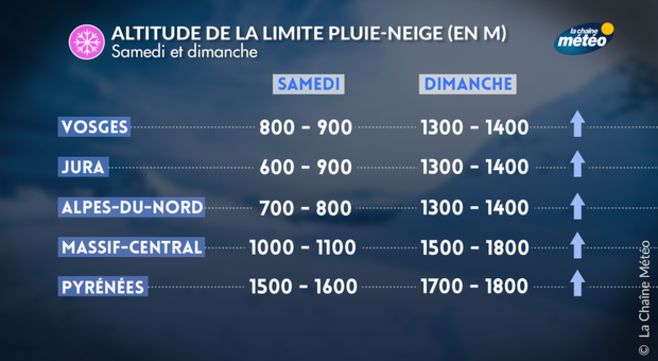 Les précipitations (pluie - neige) se pousuivent ce dimanche sur les reliefs de l'est, avec une remontée de la limite pluie - neige vers 1000 m ce dimanche sur les Vosges, le Jura et le nord des Alpes : l'air froid parvient néanmoins à résister quelque peu sur la flanc est de la France, évitant un trop grand lessivage, d'autant plus que l'isotherme va rebaisser cette nuit et lundi avec le retour de la neige dès 600 à 800 m sur ces massifs.